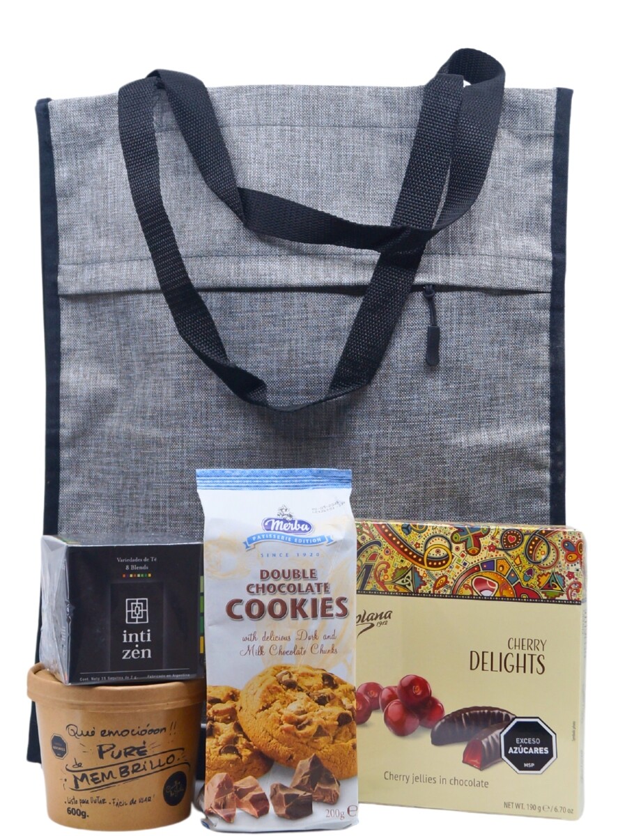 Conteniendo: caja de té IntiZen surtido, puré de membrillo artesanal Cuatro de Julia, chocolates con cereza Goplana y cookies Merba con chips de chocolate